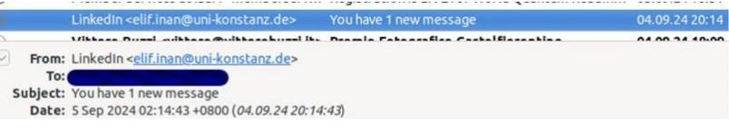 Nell’immagine qui sopra pur comparendo LinkedIn nel mittente, è evidente che l’indirizzo di posta da cui proviene la mail non ha nulla in questo caso una buona campagna di security awareness diminuirebbe di molto il rischio.